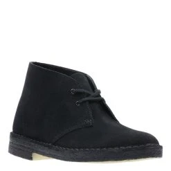 Cultural cachet and design DNA: no shoe is quite like the Clarks Originals Desert Boot. Every design detail today remains true to that first pioneering pair – here, the boot’s crafted, clean lines are enhanced with premium black suede, finished with an unfussy lace fastening. The authentic, sustainably sourced crepe sole completes this distinctive silhouette. Instantly recognizable, forever iconic. A true original.
