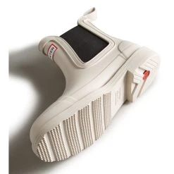 Crafted from natural FSC®-certified, vegan rubber, the 100% waterproof Commando Chelsea is a new addition to Hunter’s iconic Original collection. Retaining all the beloved features of the Original Chelsea Boot, like the flexible gusset and Hunter grip, this new silhouette has a higher profile, reaching 15mm (0.59″) further up the leg. This light grey women’s commando Chelsea hybrid style also features an updated recycled polyester lining and insole.