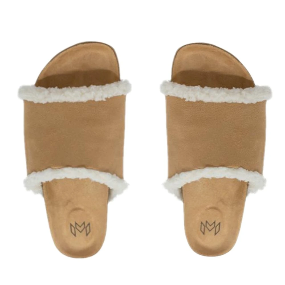 Malvados Women’s Meg Slide in Sand is their new faux microsuede shearling slide. Made with a supportive molded cork foot bed and a double sided faux fur lined upper. This slide is designed to mold and cradle your foot in comfort.