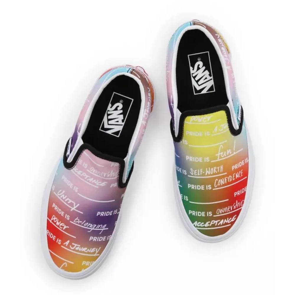 First introduced in 1977, the Vans #98—now known as the Classic Slip-On—instantly became an icon in Southern California. Fast forward to today, and the Classic Slip-On is known worldwide for its comfortable silhouette, easy wearability, and beloved design.Featuring the iconic Vans checkerboard print, the Vans Pride Classic Slip-On in Rainbow/True White is an everyday essential with true “Off The Wall” style. This slip-on shoe also includes low profile canvas uppers, supportive padded collars, elastic side accents, and signature rubber waffle outsoles.